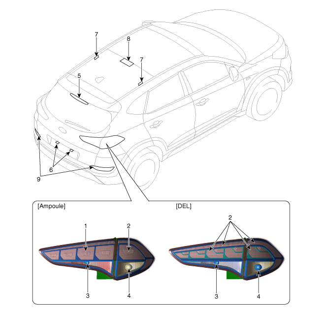 6. Eclairage de la plaque d'immatriculation 7. Plafonnier (toit ouvrant panoramique) 8. Plafonnier (toit normal) 9. Feu antibrouillard arrière |