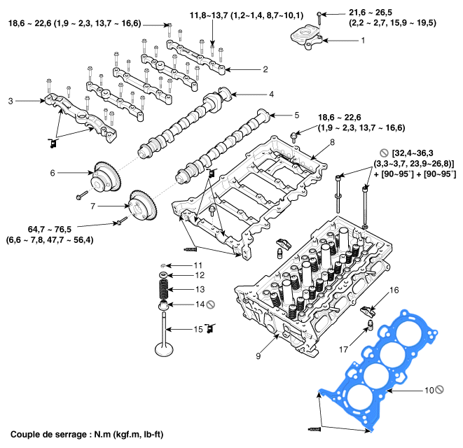 7. CVVT d'admission 8. Support de cames 9. Culasse 10. Joint de culasse 11. Verrouillage de retenue 12. Retenue |