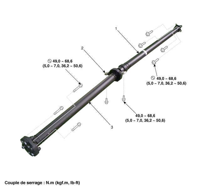 | 1. Arbre de transmission avant 2. Support du roulement central |